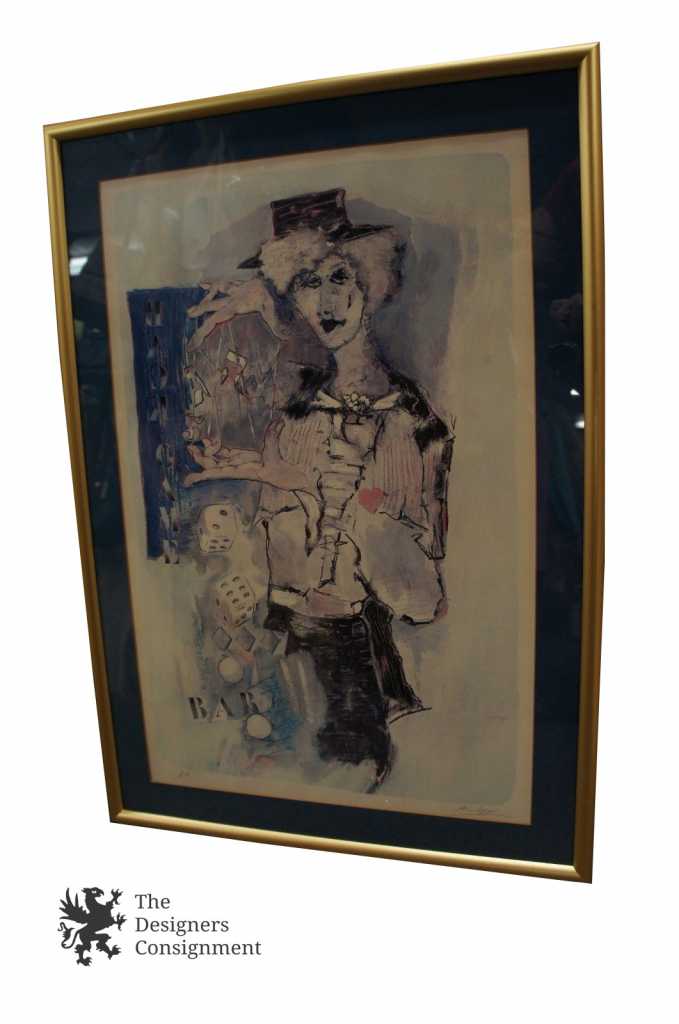 Here is a unique Israeli Clown Print. Features a clown with dice, cards and coins. On the left side it says back game next to some hebrew letters, and on the bottom it says Bar. A truly bizarre yet unique piece of art.