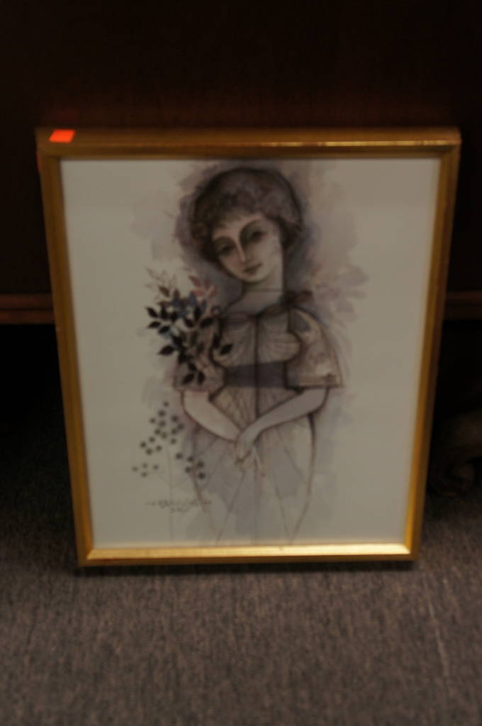 Unique Black & White Print On Board Woman W/ Flowers Framed In Gold Artwork