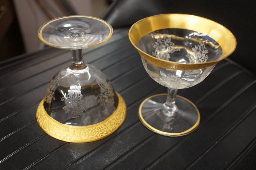 5 Tiffin Etched Low Sherbert Glasses Gold Trimmed Mouth & Stem Cordial Crystal