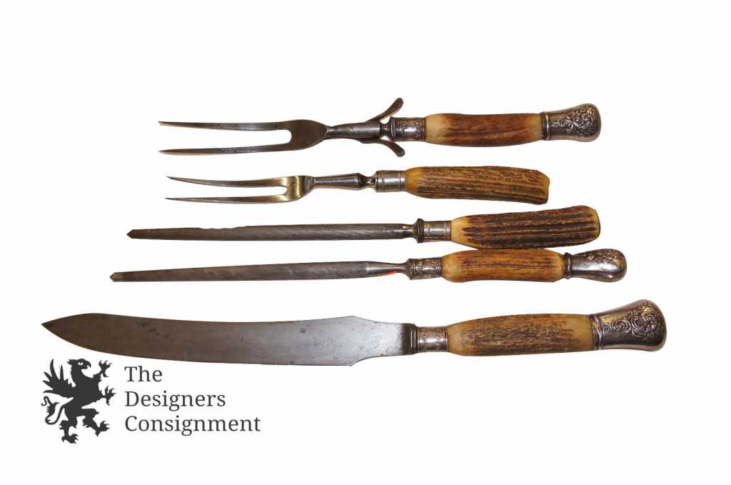 These are great pieces of Staghorn carving tools. Included is a Landers, Frary and Clark carving knife, a carving fork with an 1886 patent date, a carving fork,. All of the pieces have a staghorn handle and sterling silver accents to them. These are great pieces and they would make wonderful addition to your home or collection.