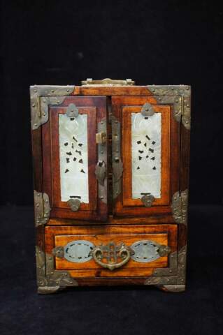 Vintage Antique Asian Chinese Oriental Wooden Jade Brass Handled Jewelry Box