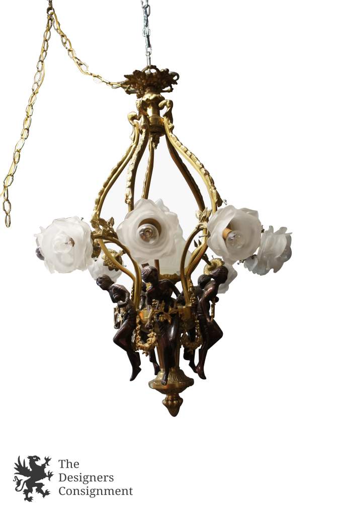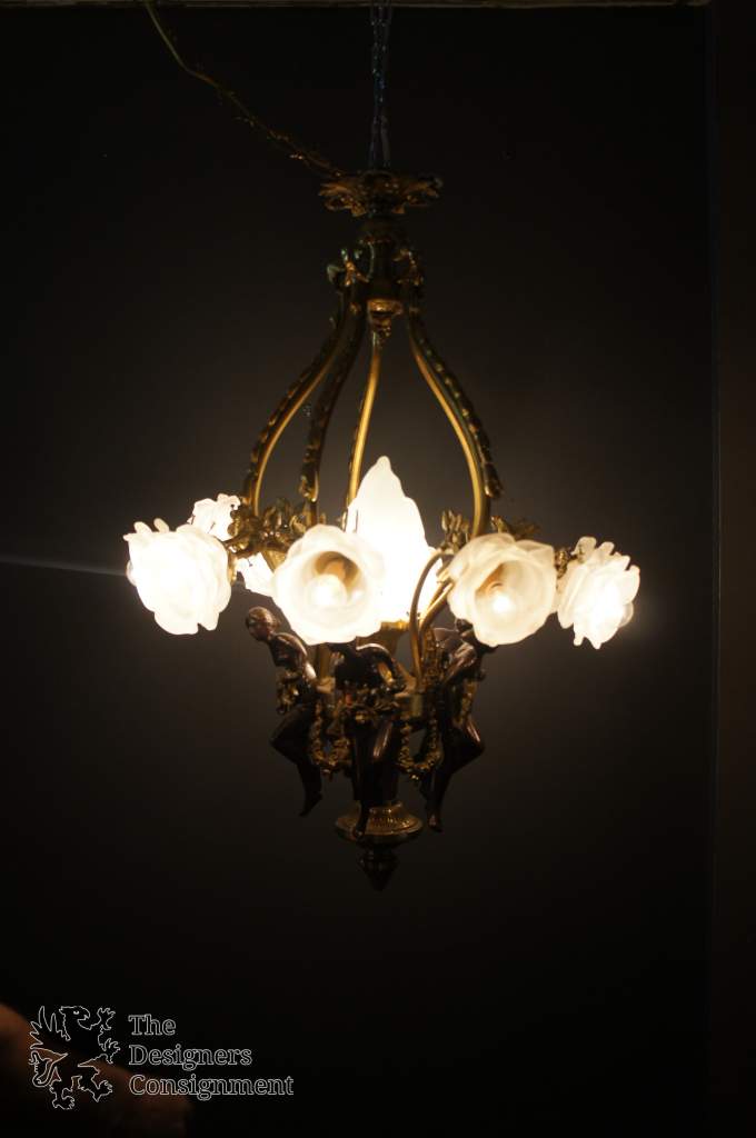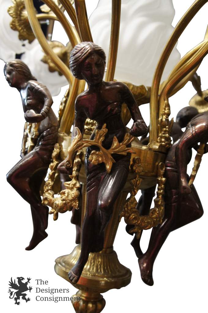Beautiful Rare Antique Brass Women Frosted Glass Floral Shades Chandelier