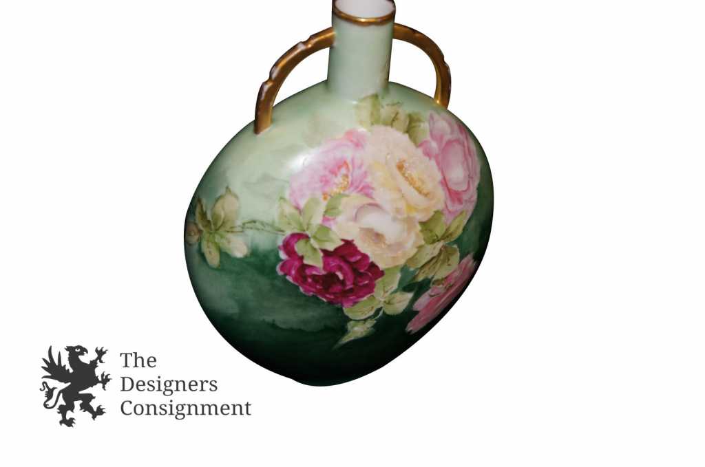 This is a gorgeous piece from the French porcelain maker Haviland France. It is a canteen vase that is decorated with floral designs and it features gold trim handles to it. The piece has the 1894-1931 green "Haviland France" mark. This is a truly beautiful piece and it would make a wonderful addition to your home or collection.