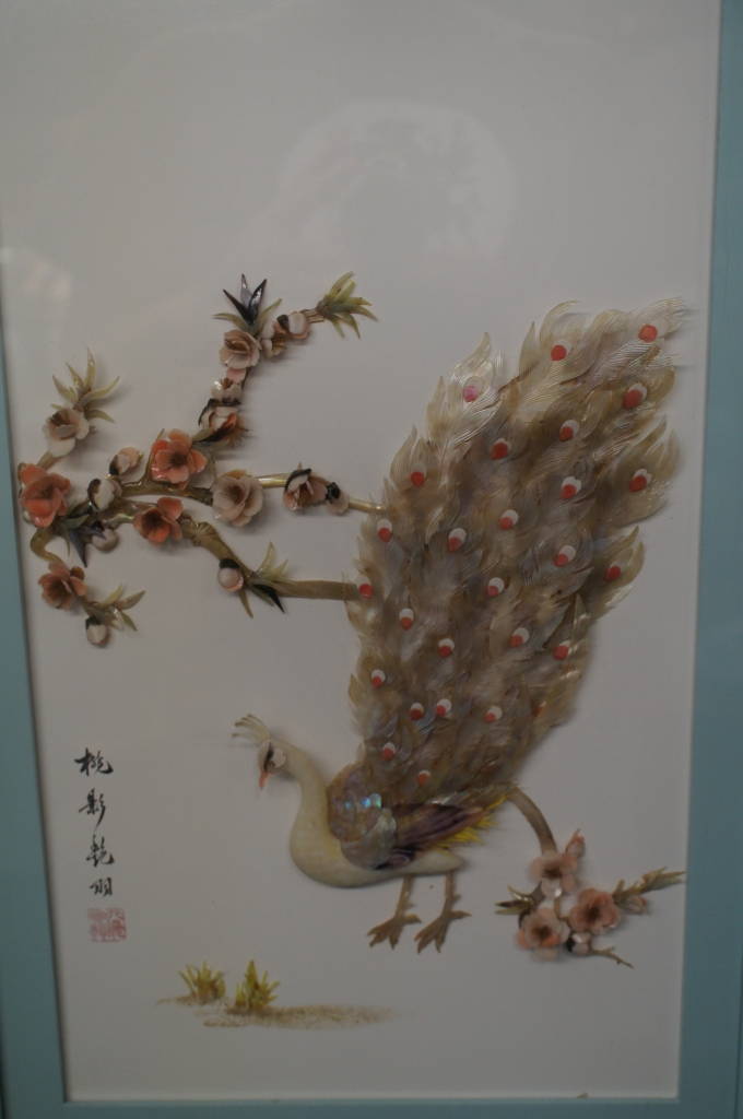 Stunning Asian Oriental 3D Shell Plastic Floral Peacock Bird Art w/ Frame
