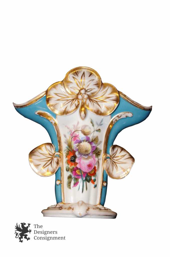 These are beautiful pieces of "Old Paris" porcelain. They are gorgeous handpainted vases with flower designs to them as well as raised porcelain flowers and leaves on the front and a lovely gold trim. These are absolutely gorgeous pieces and they would make wonderful additions to your home or collection.