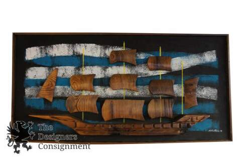 Here is a great vintageMid Century Witco tiki art. A Large profile boat carved from wood in their famous fashion. Mounted on a black cloth with painted wave forms. Framed in dark walnut solid wood. Signed by the artist, “Wilrongo.” This piece has a wonderful finish and stands out in any room. A fine addition to any home.