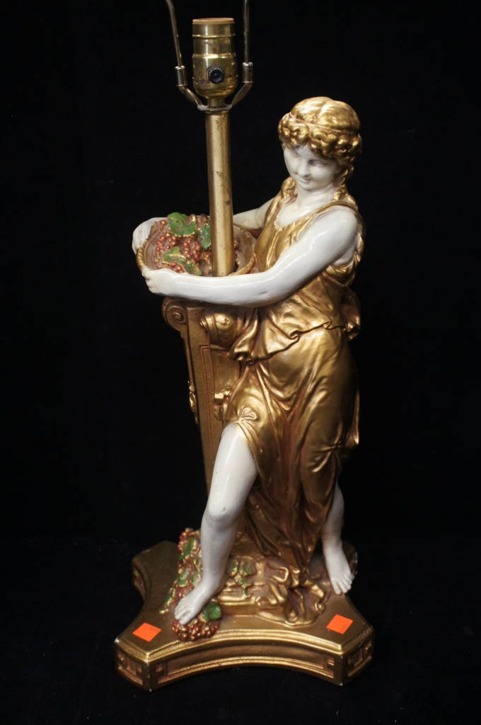 Pair Of 2 Vintage Porcelain Gold Lady Flower Grape Basket Pillar Table Lamps