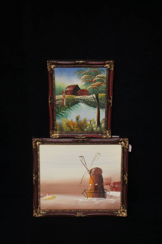Lot Of 2 Asian Oriental Farm Pond Women Windmill Lighthouse Scene Oil Paintings