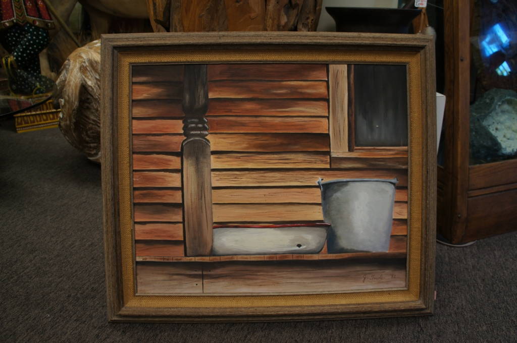 Rustic Signed J. Towle Oil Painting Country Cabin Deck Bowl & Bucket W/ Frame