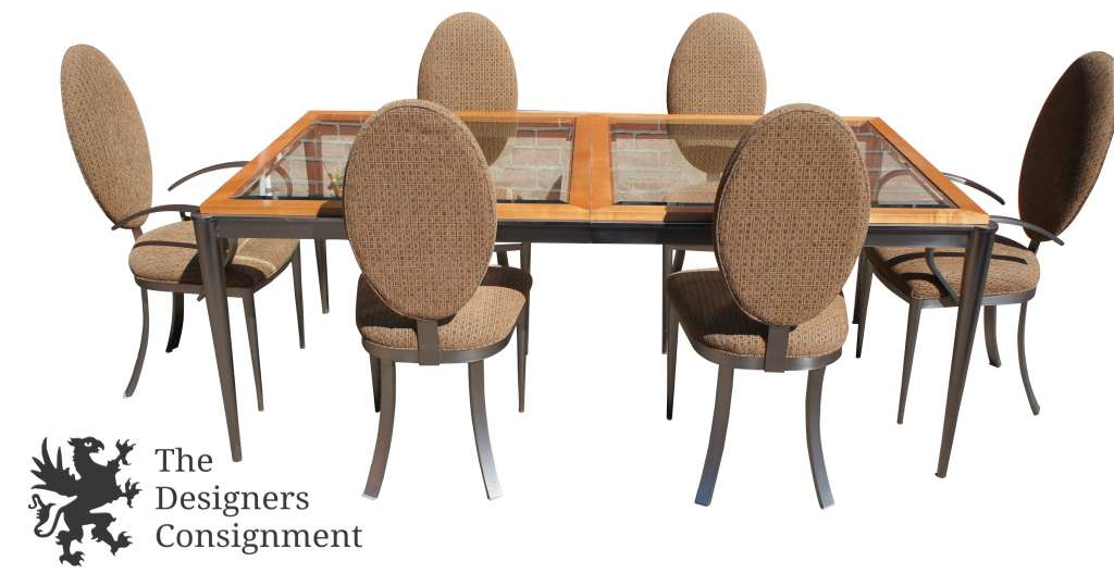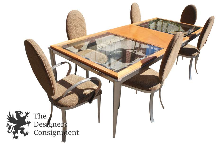 Features a glass top modern table with light wood and metal accents