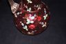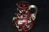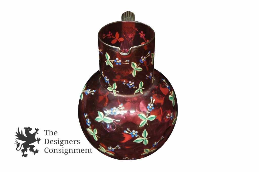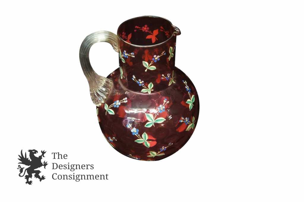 This is a lovely cranberry glass pitcher. This piece is gorgeously painted with floral designs and the remains of gold gilding and a reverse thumbprint pattern and a reed handle to it. This piece also has a polished pontil mark to it. This is an absolutely beautiful piece and it would make a wonderful addition to your home or collection.