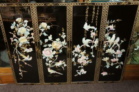 4 Lacquer Chinese Oriental Panel Screen Divider Birds Trees Painted Floral Asian