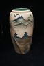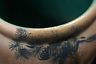 There is hand painted scenes with cranes standing side by side on top of a cliff, mountains and clouds in the background