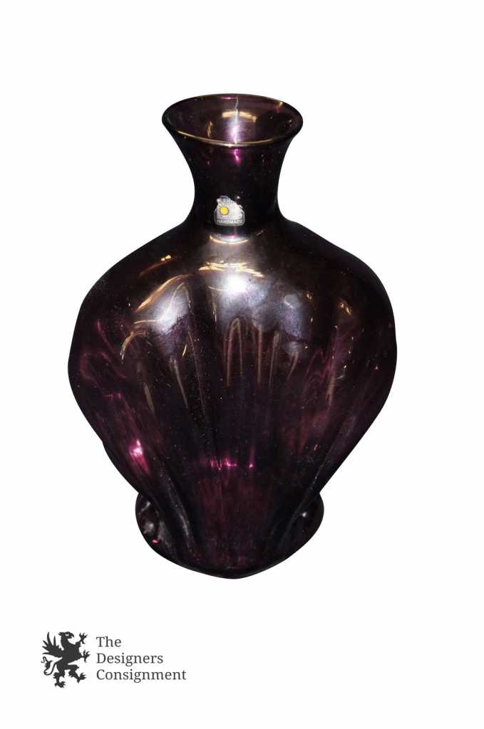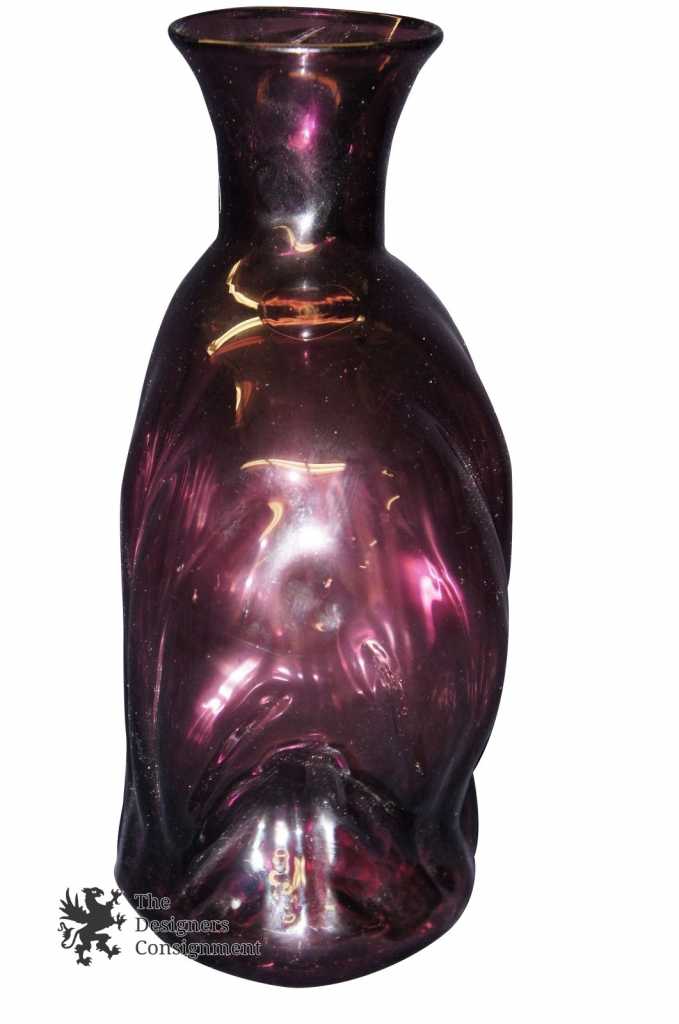 This is a gorgeous piece from the American company, Blenko Glass. It is a amethyst glass vase in the shape of a seashell and has the block "B" sticker on it which means it is from 1982 to 1999. This piece has a lovely purple color to it and a one of a kind hand blown form to it. This is an absolutely beautiful piece and it would make a wonderful addition to your home or collection.