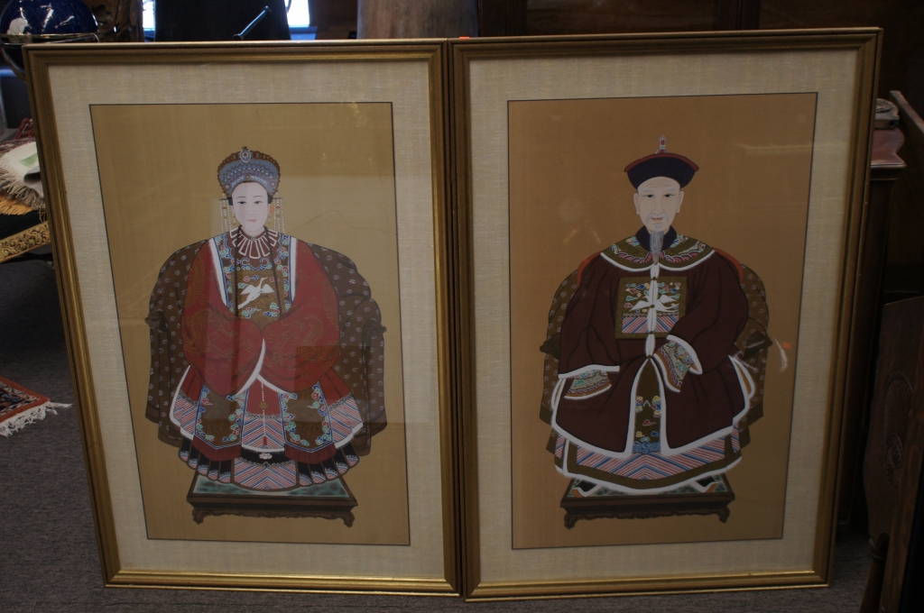 Pair Of 2 Handpainted Asian Oriental Emperor Empress Silk Screen Framed Artwork