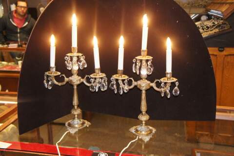 2 Vintage Brass Electric Table Lamps Candelabras Floral Crystals 3 Footed Spain