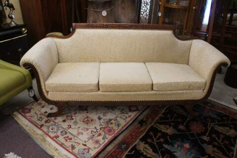 Antique American Empire Carved Solid Walnut Sofa Settee Couch Brass Capped Feet