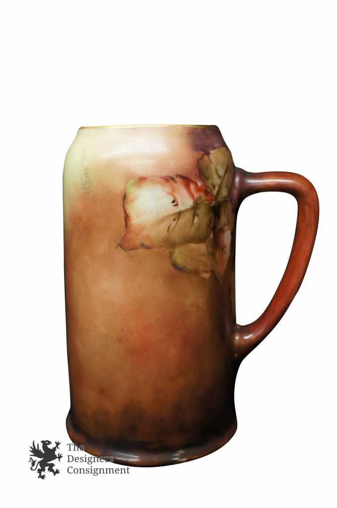 Here is a wonderful Antique hand painted tankard. Unmarked. Features blackberries and leaves over a warm autumn reddish orange. Don't miss the opportunity to add this beauty to your collection