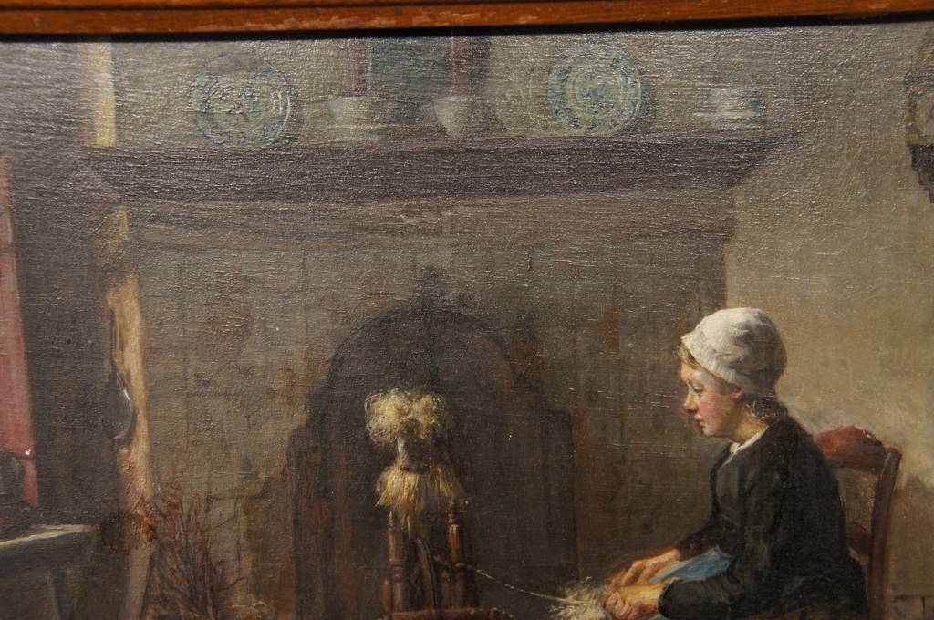 Joseph de Groot Antique Oil on Board 1828-1899 Dutch Woman Spinning Yarn Sew