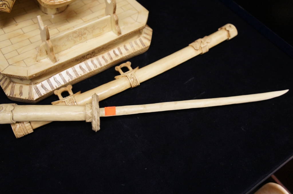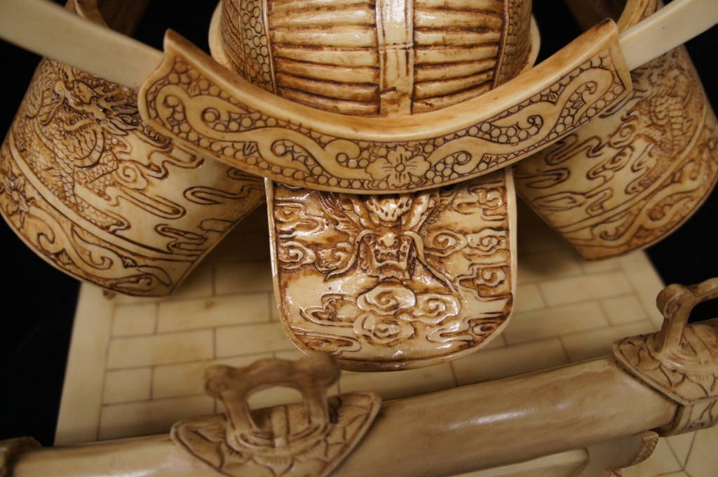 Asian Oriental Carved Camel Bone Scrimshaw Warrior Samurai Helmet & Sword Dragon