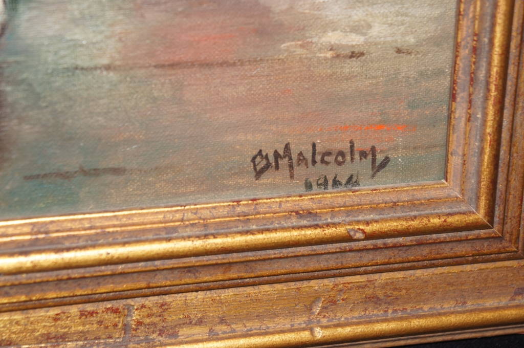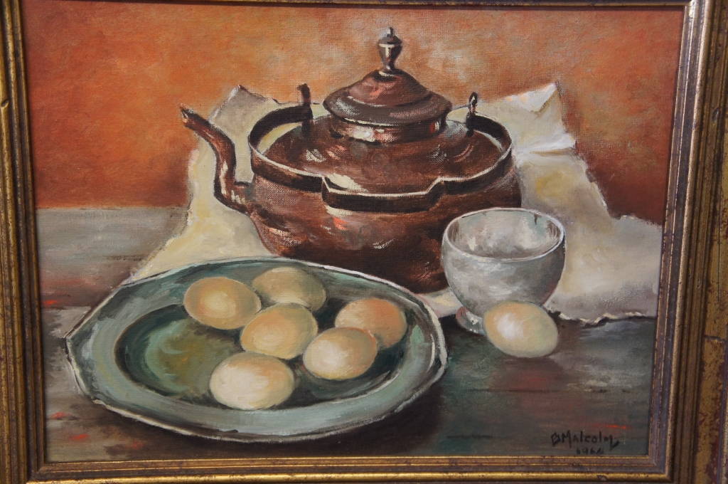 Oil Painting Still Life Coffee Pot Eggs Artist Signed B. Malcolm Framed on Board
