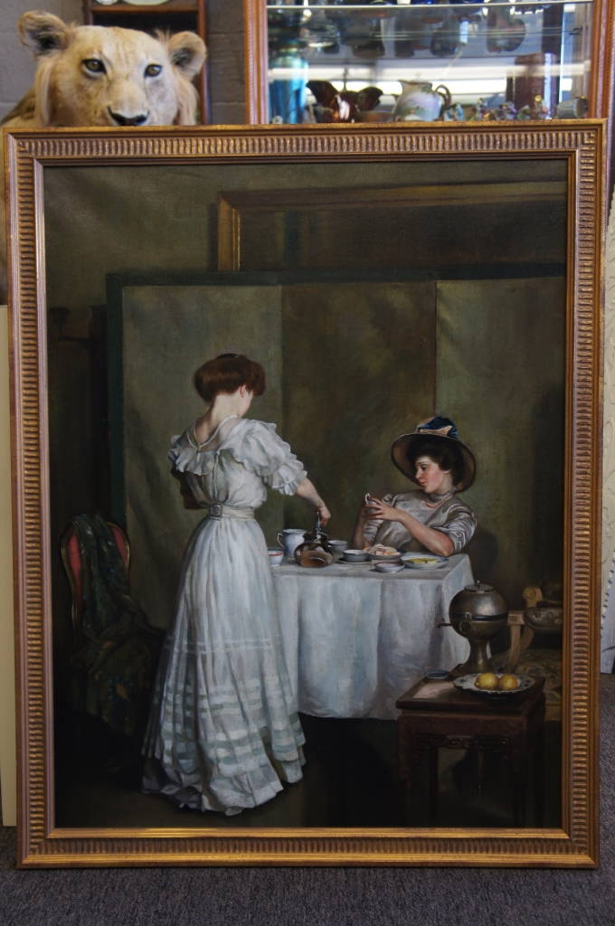 Vintage Oil on Canvas Elegant Victorian Style Scene Women Tea Coffee Artwork