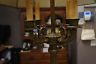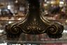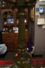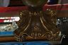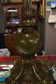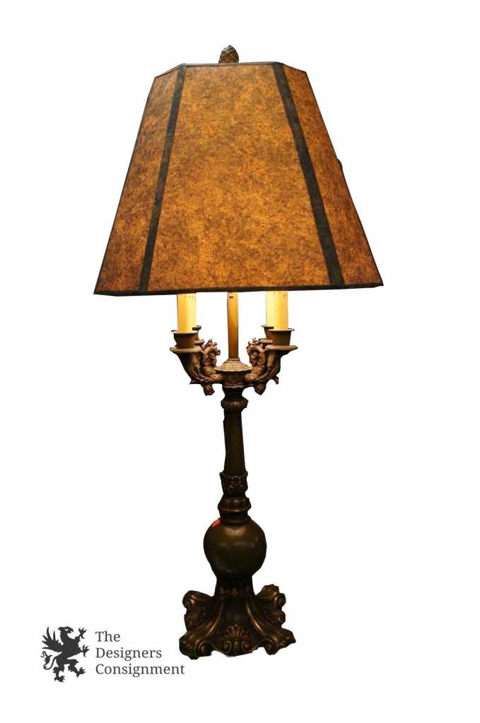 Here is lovely table lamp. Baroque revival with a Torchiere/ candelabra style top. 4 lights around the outside centered by a bigger light towards the top. This lamp has green and gold accents as well as figural faces towards the bottom of each side of the base. There are 3 different light settings. All four posts can be lit separately as well as the center post, or you can have all 5 lit together. A great lamp for any office or home.