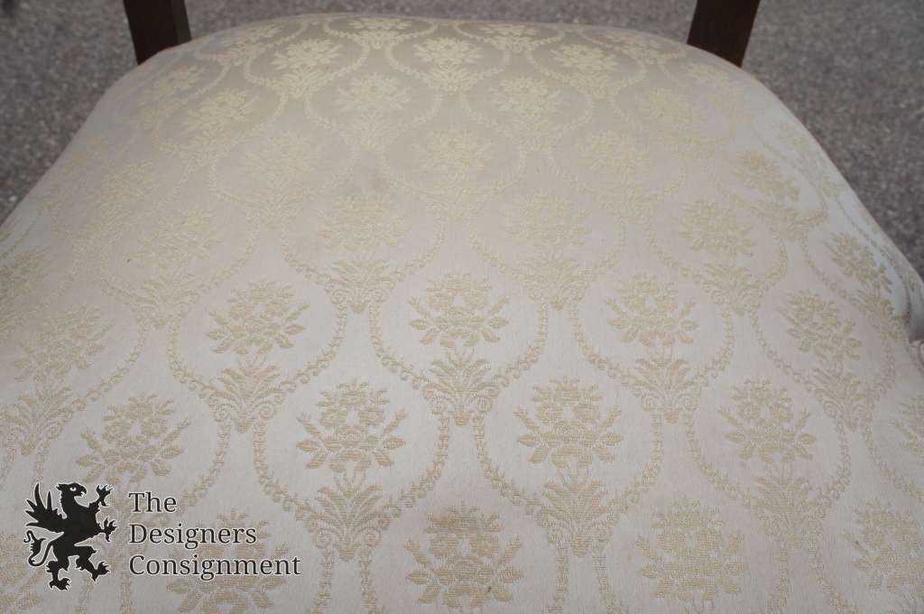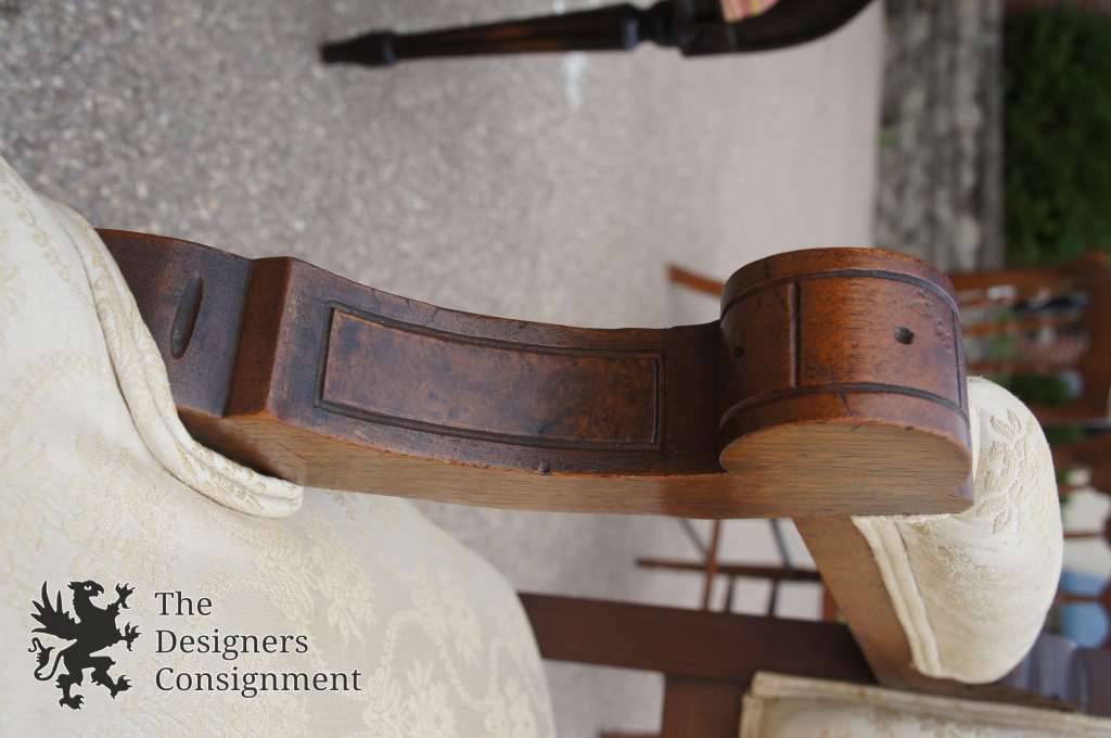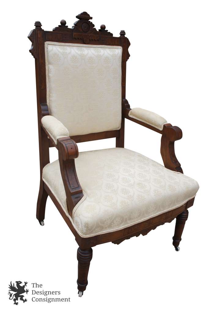 Antique Victorian Era Gentleman's Chair. Made from Walnut with burled accents. Features carved cresting with finials and intricate lower apron. Finished in a brocade fabric. A great addition to any setting.