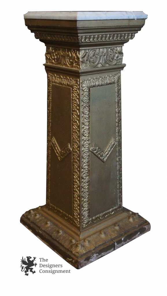Here is a gorgeous Art Nouveau Marble top pedestal. Made from solid wood with a gesso carved exterior that was then painted gold. The marble is white and features a cut edge. A truly spectacular piece that will look wonderful in your home!