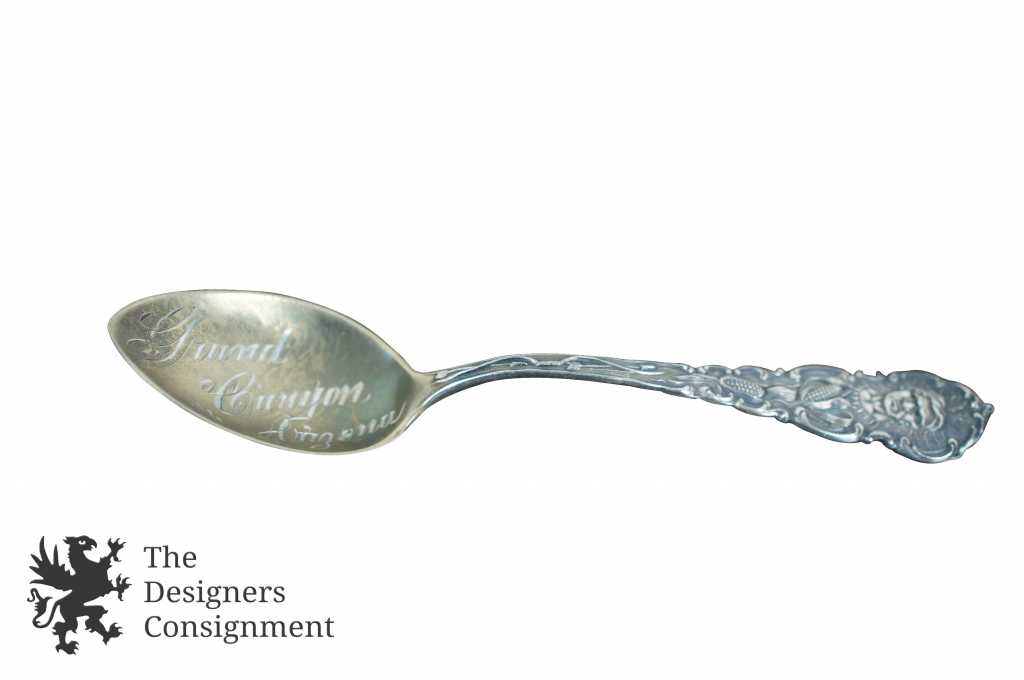 Here is a great piece of American history. This sterling silver spoon features in hand etched script "Grand Canyon, Arizona" in the bowl and on the handle there is a Native American with some maize on the reverse there is various Indian items.