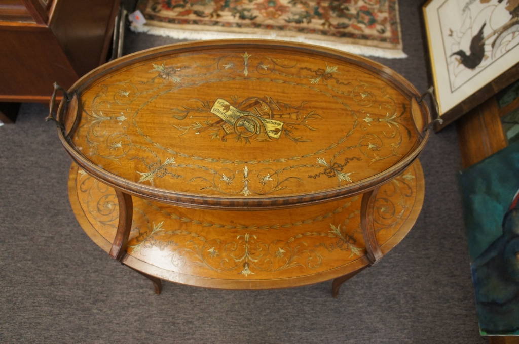 Here is a stunning piece of neoclassical furniture. Features intricate satin andfruit-woodmarquetry with a musical motif. The table itself is a butlers table with a glass top removable tray. Two Tier with a fabulous shape! Will look great in any home.