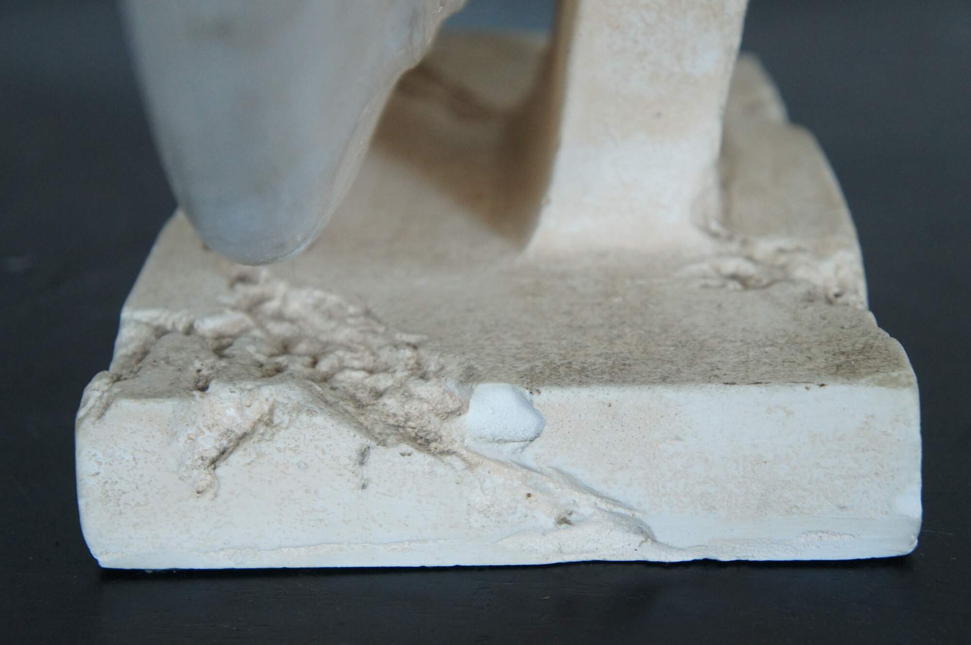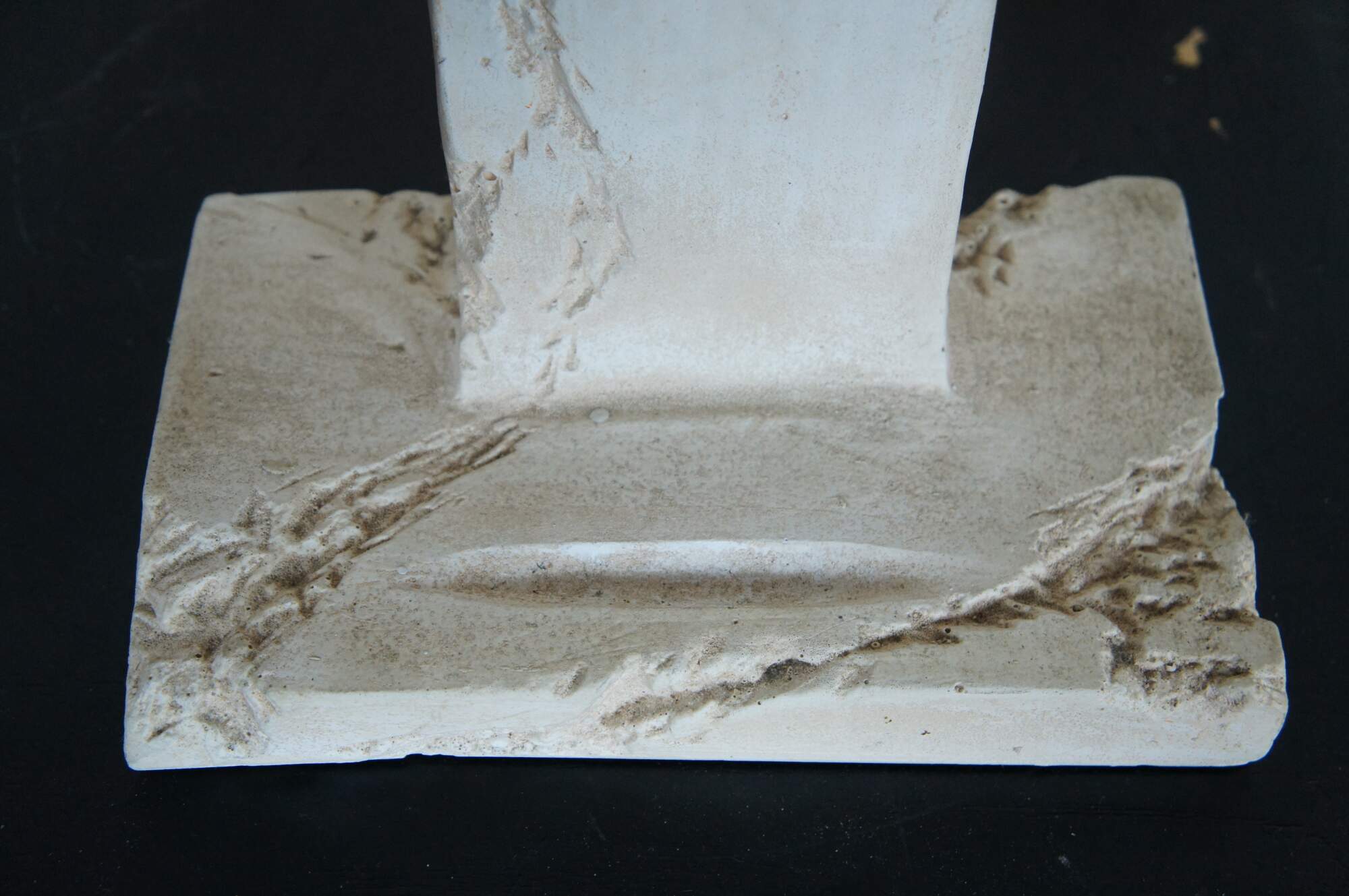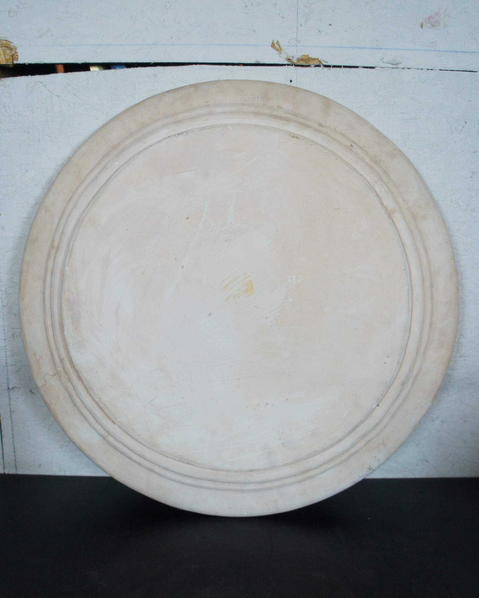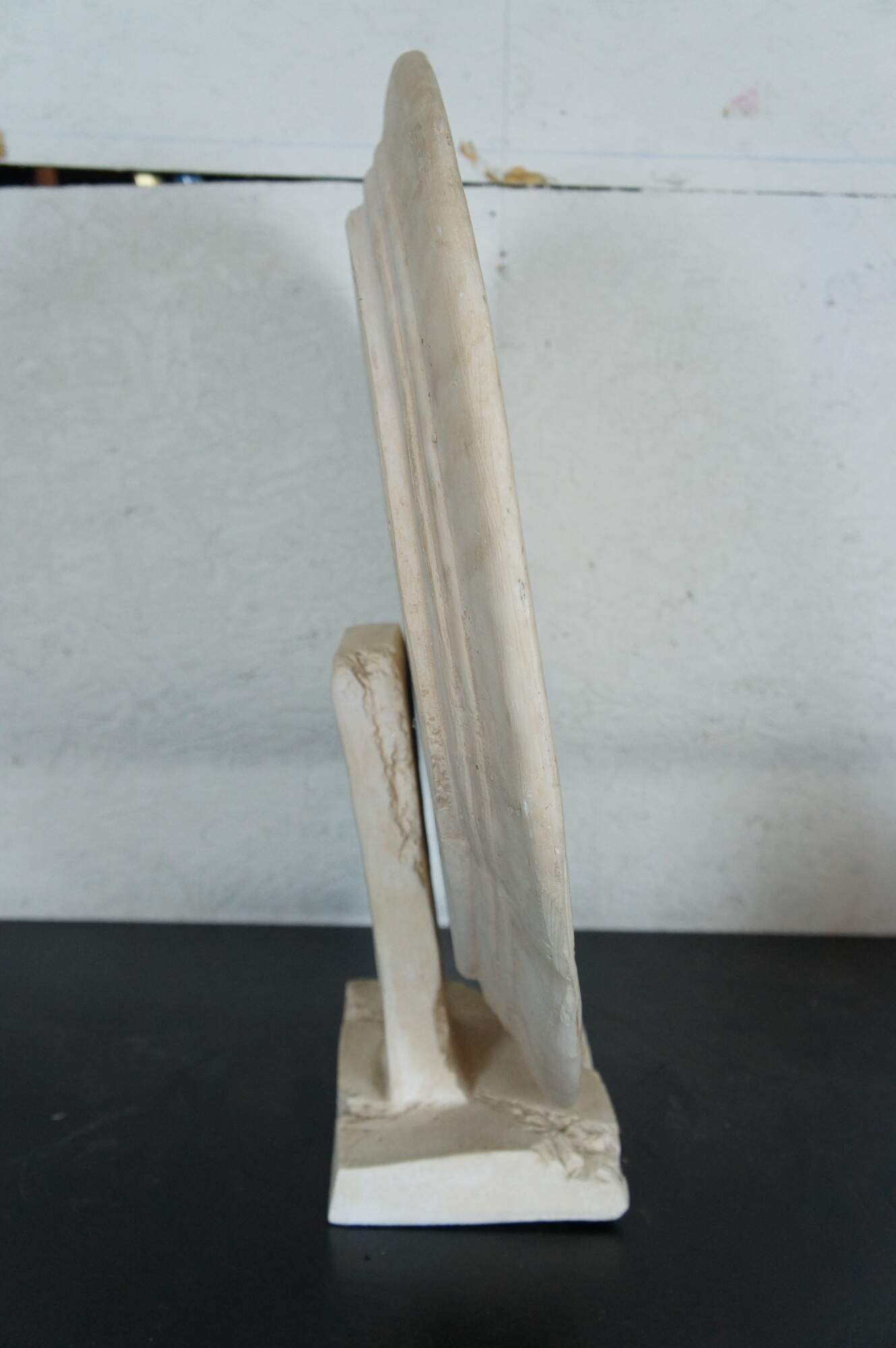 Vintage chalkware art sculpture display featuring a plate / charger / round disk with geometric patterns. Includes base / stand.