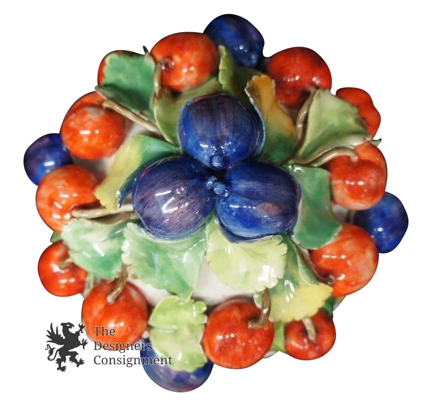 This lidded compote was made in Italy. Features a colorful lid with berries and cherries over leafy accents. A wonderful addition to any home.