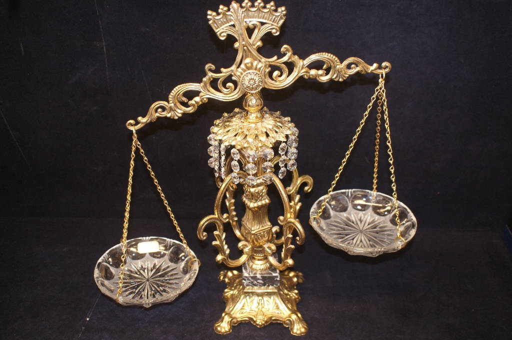 Vtg Brass + Leaded Crystal Balance Justice Scale Marble Accent Prisms Apothecary