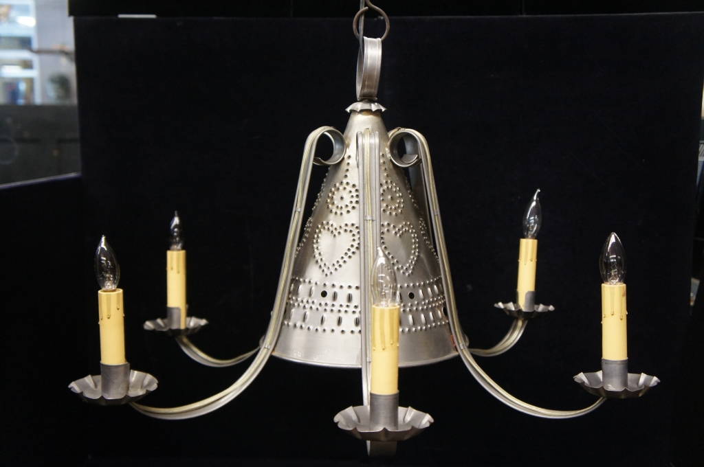 Vtg Pierced Tin 6 Light Hanging Chandelier W/ Drop Light Rustic Country Cottage