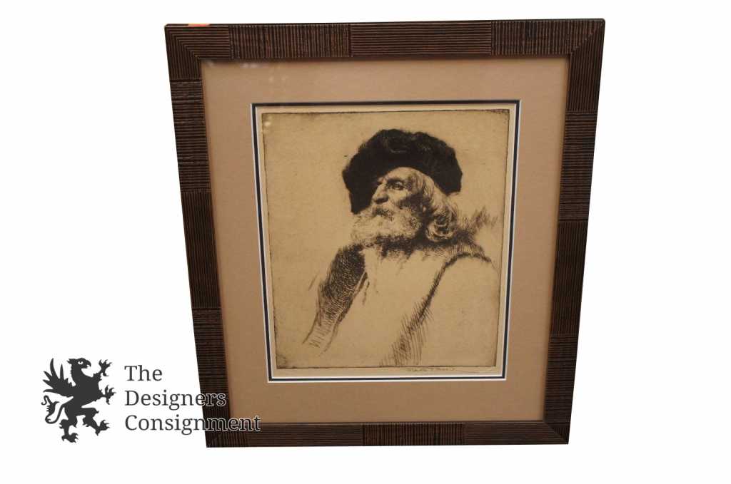 A wonderful piece by Franklin T. Wood. Signed in the bottom right corner. Titled "Man in Black Hat' This piece was originally purchased at the Marshall Fields Company. Franklin lived from 1877-1945. He lived in Vermont, Massachusetts, and is is known for illustration, etching, landscape painting.