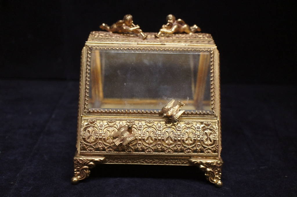Antique Victorian Brass Jewelry Display Case Beveled Glass Vanity Box Putti