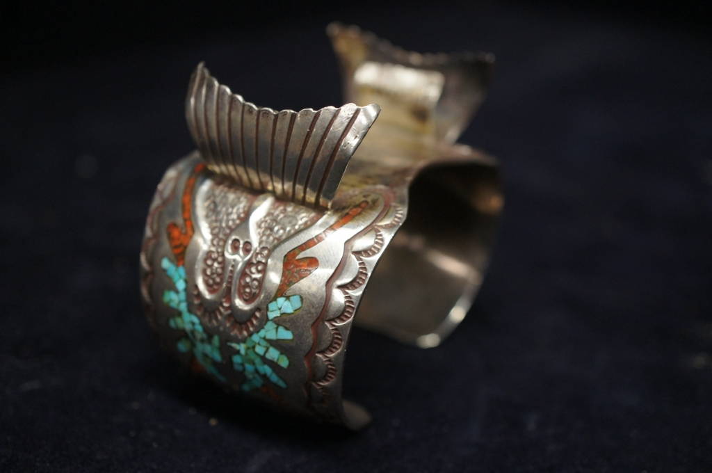 Vtg Navajo Southwestern Watch Band Sterling Silver Turquoise Coral Cuff Bracelet