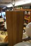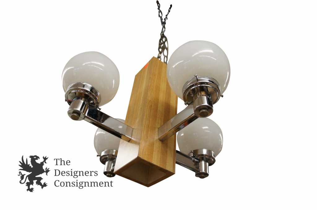 Here is a lovely mid century modern swag lamp. Features 4 opaque glass globes and one down light. The center is covered in an oak veneer. The light arms are chrome. Will look magnificent in any home or office