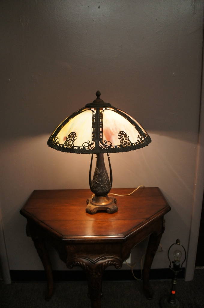 Stunning Pairpoint Art Nouveau Slag Glass Lamp Iron W/ Ornate Filigree Accents