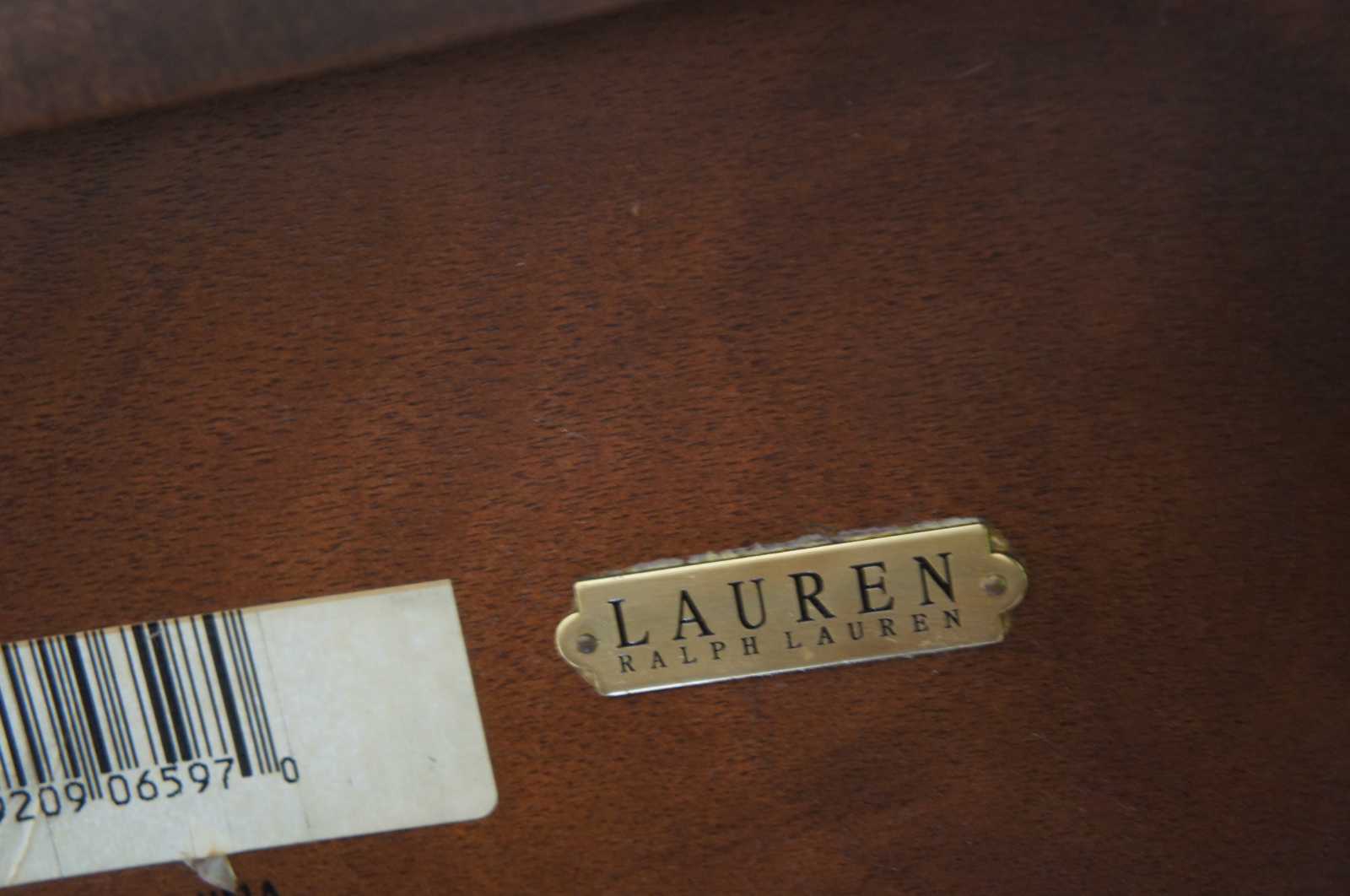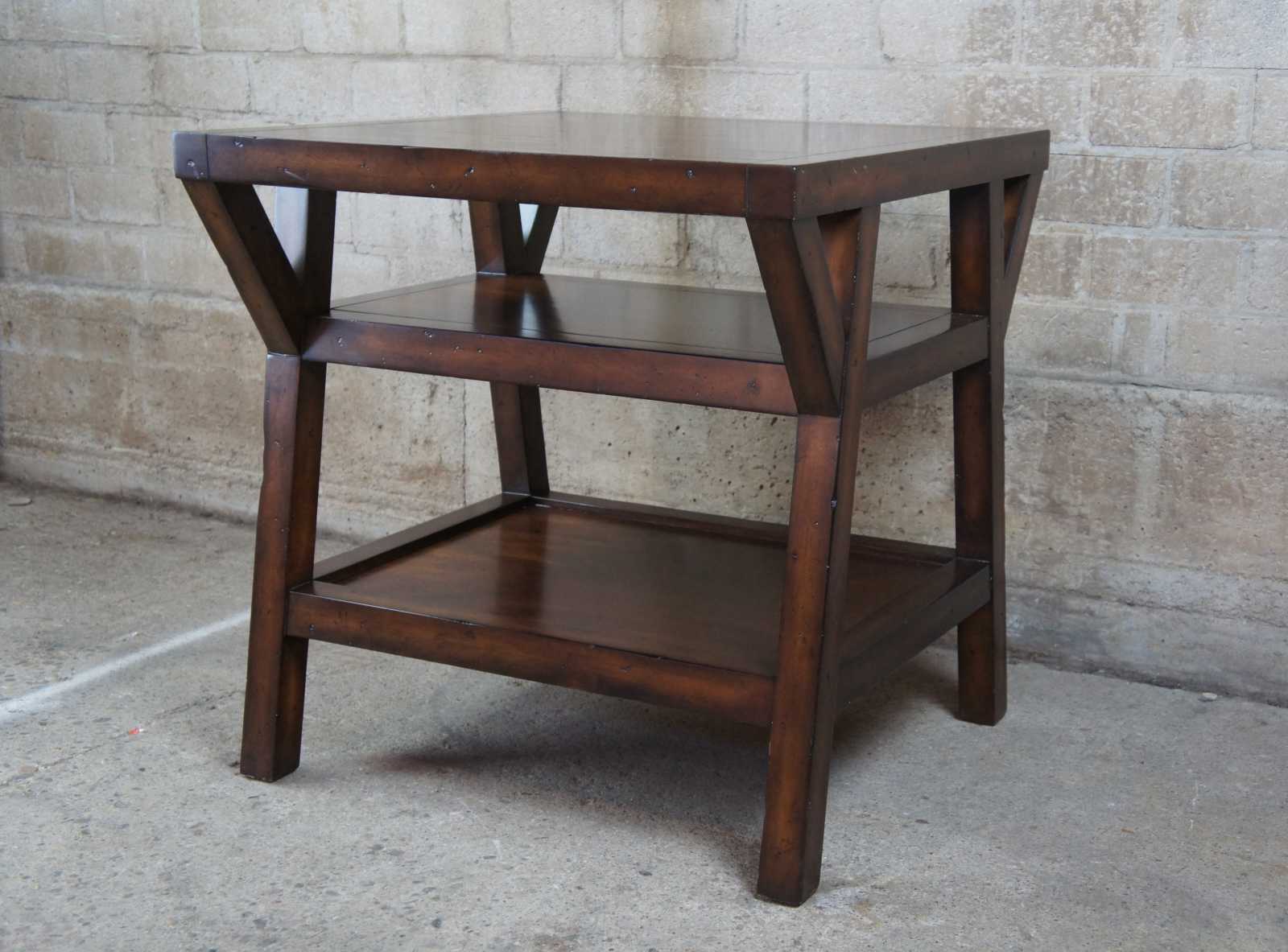 Square tiered side table by Lauren Ralph Lauren. Made from mahogany with a naturally distressed finish. Features a three tiered design with paneled top and inset lower shelf.