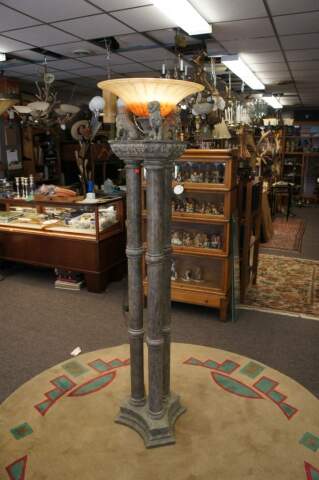 Magnificent 73" Columned Torchiere Floor Lamp W/ Lions & Flared Glass Shade Dims