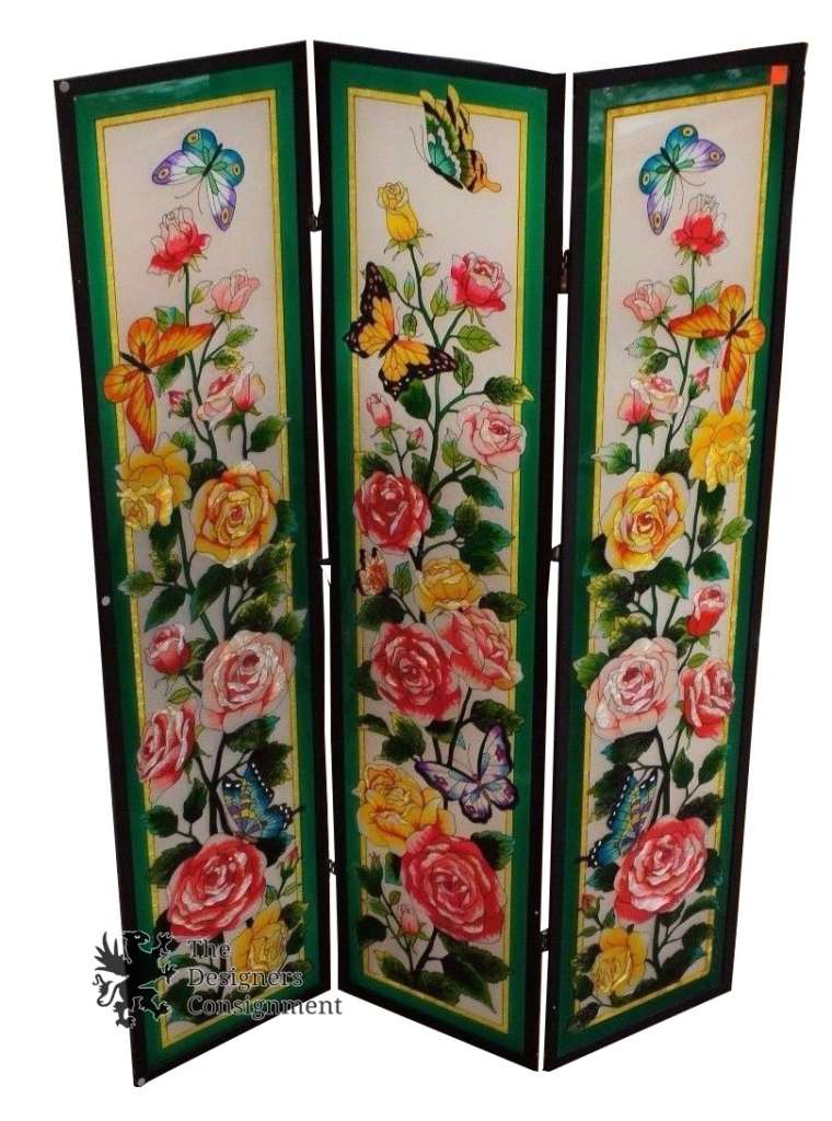 Vivid 3 Panel Stained Glass Screen Vintage Window Divider Butterflies & Roses