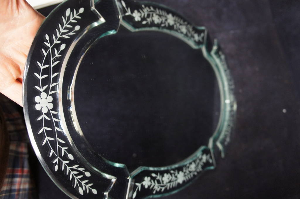 Lg. Oval Venetian Footed Mirror Trivet Etched Engraved Glass Vanity Tray Plateau