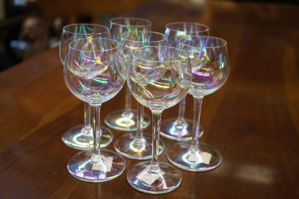 7 Vtg Iridescent Hand Blown Cordial Glasses Opalescent Stemware Whisky Scotch