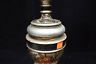 A fun arts + crafts lamp. Made from wood with a hand painted exterior.