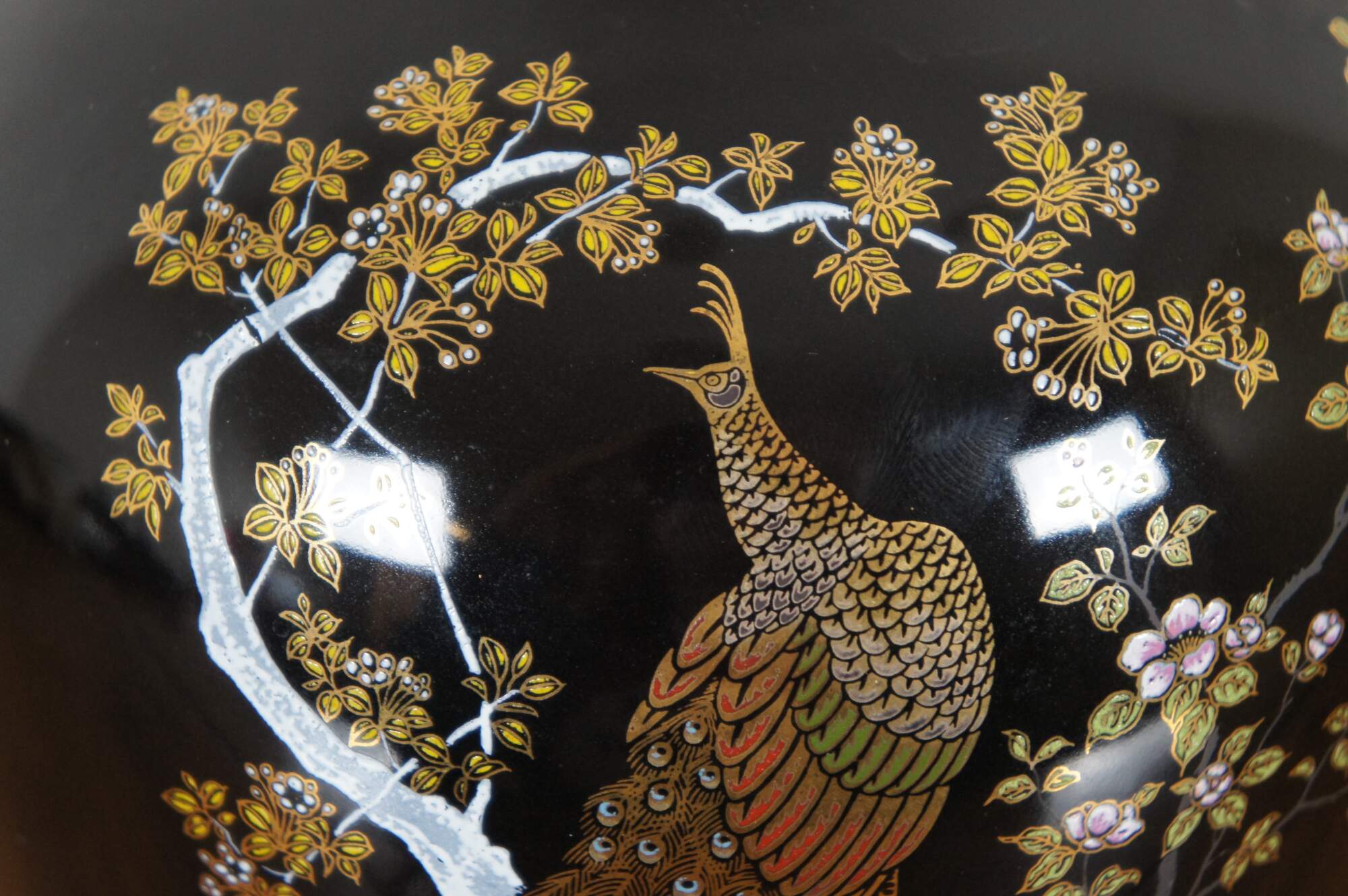 Vintage black porcelain Satsuma vase or urn featuring peacocks and cherry blossom trees. Made in Japan.