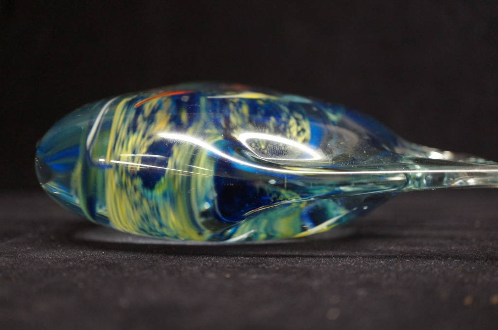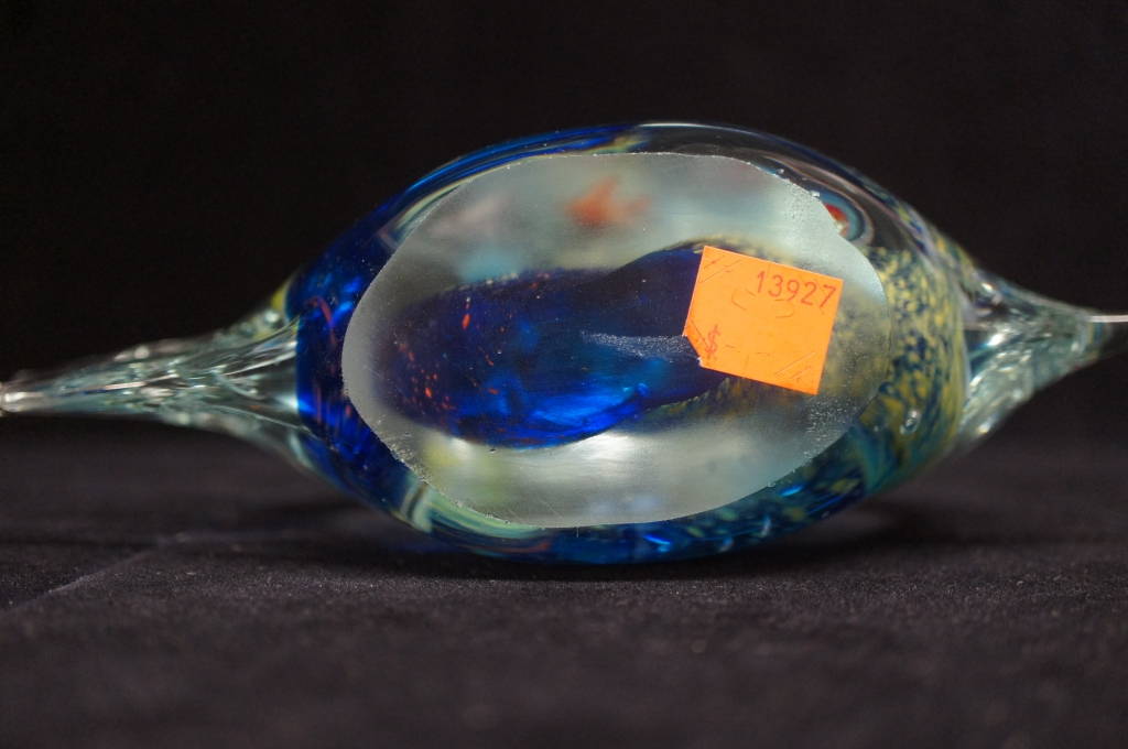 Glass Fish Paper Weight With Fish On the inside of the glass/crystal fish with ascents of Blue, Red, and yellow.