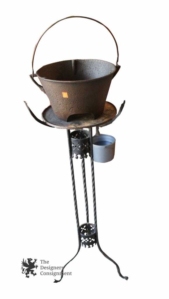 A unique primitive cast iron kettle. Comes with a black twisted iron stand. The kettle itself is footed, so it can also be used alone. A great addition to any home!