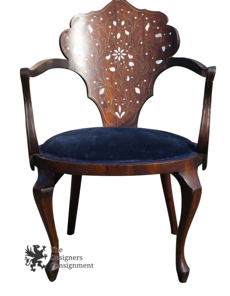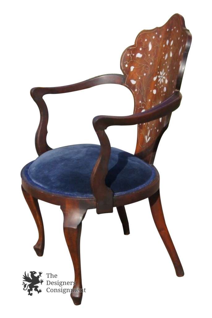 Made from Mahogany with mother of pearl inlay and a velvet seat. A stunning accent chair for any home or office